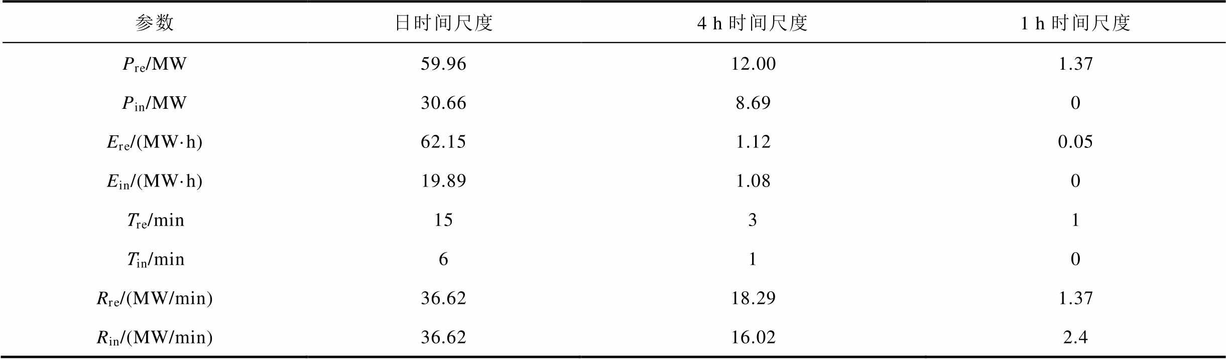 由于电力负荷在不同时间尺度上会呈现不同的变化特性,而新能源出力又具有很强的间歇性和随机性,因此不同时间尺度下的系统频率波动特性和调频能力需求也会存在一定差异。本研究在日时间尺度的基础上,另选取4 h和1 h作为时间尺度,参考日时间尺度下的频率波动特征指标体系,分析系统频率的波动特性,并评估调频能力需求。