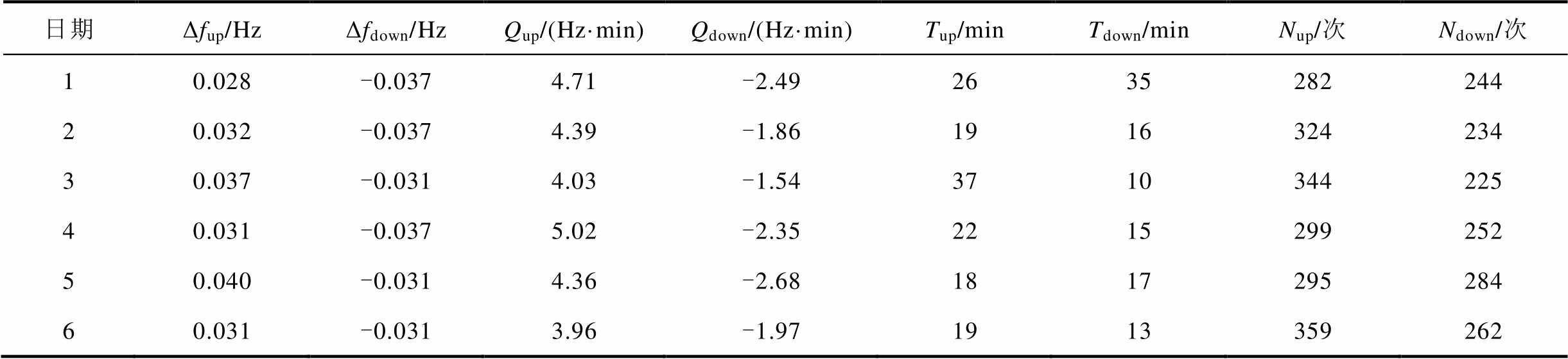 算例系统在该月的频率波动特征描述矩阵见附表1。可知在该月内,Δfup的最大值为0.049 Hz,Δfdown的最小值为-0.046 Hz,较大的波动幅值说明系统的功率不平衡量较大。越死区上限的能积最大值为5.90 Hz·min,最小值为1.55 Hz·min;越死区下限的能积最大值为-0.50 Hz·min,最小值为-3.18 Hz·min。较大的能积揭示了频率偏离死区的幅度较大,越限持续时间较长。