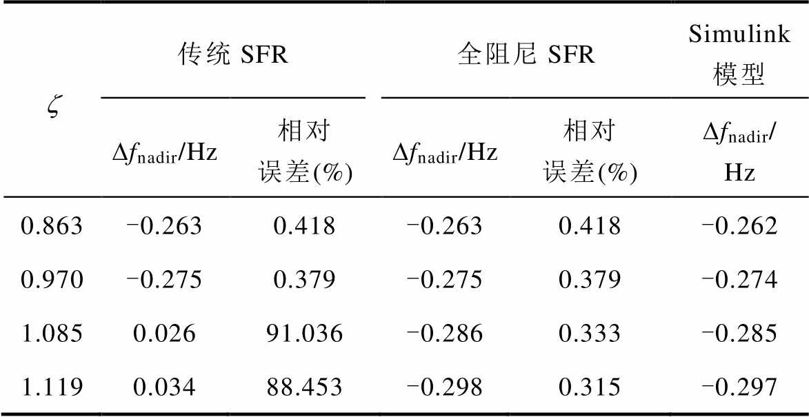 z传统SFR全阻尼SFRSimulink模型 Dfnadir/Hz相对误差(%)Dfnadir/Hz相对误差(%)Dfnadir/Hz 0.863-0.2630.418-0.2630.418-0.262 0.970-0.2750.379-0.2750.379-0.274 1.0850.02691.036-0.2860.333-0.285 1.1190.03488.453-0.2980.315-0.297