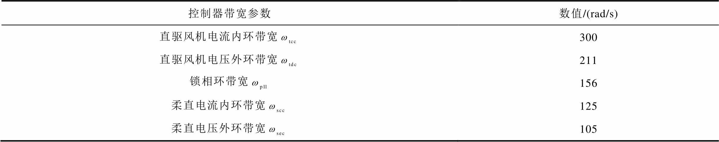 控制器带宽参数数值/(rad/s) 直驱风机电流内环带宽300 直驱风机电压外环带宽211 锁相环带宽156 柔直电流内环带宽125 柔直电压外环带宽105