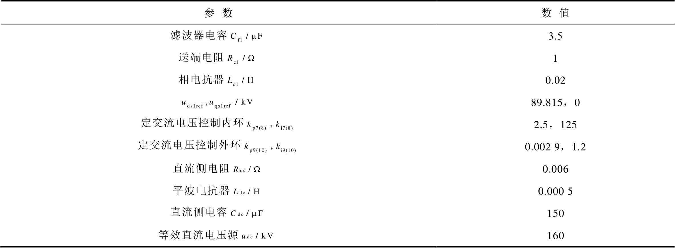 参数数值 滤波器电容3.5 送端电阻1 相电抗器0.02 89.815,0 定交流电压控制内环,2.5,125 定交流电压控制外环,0.002 9,1.2 直流侧电阻0.006 平波电抗器0.000 5 直流侧电容150 等效直流电压源160