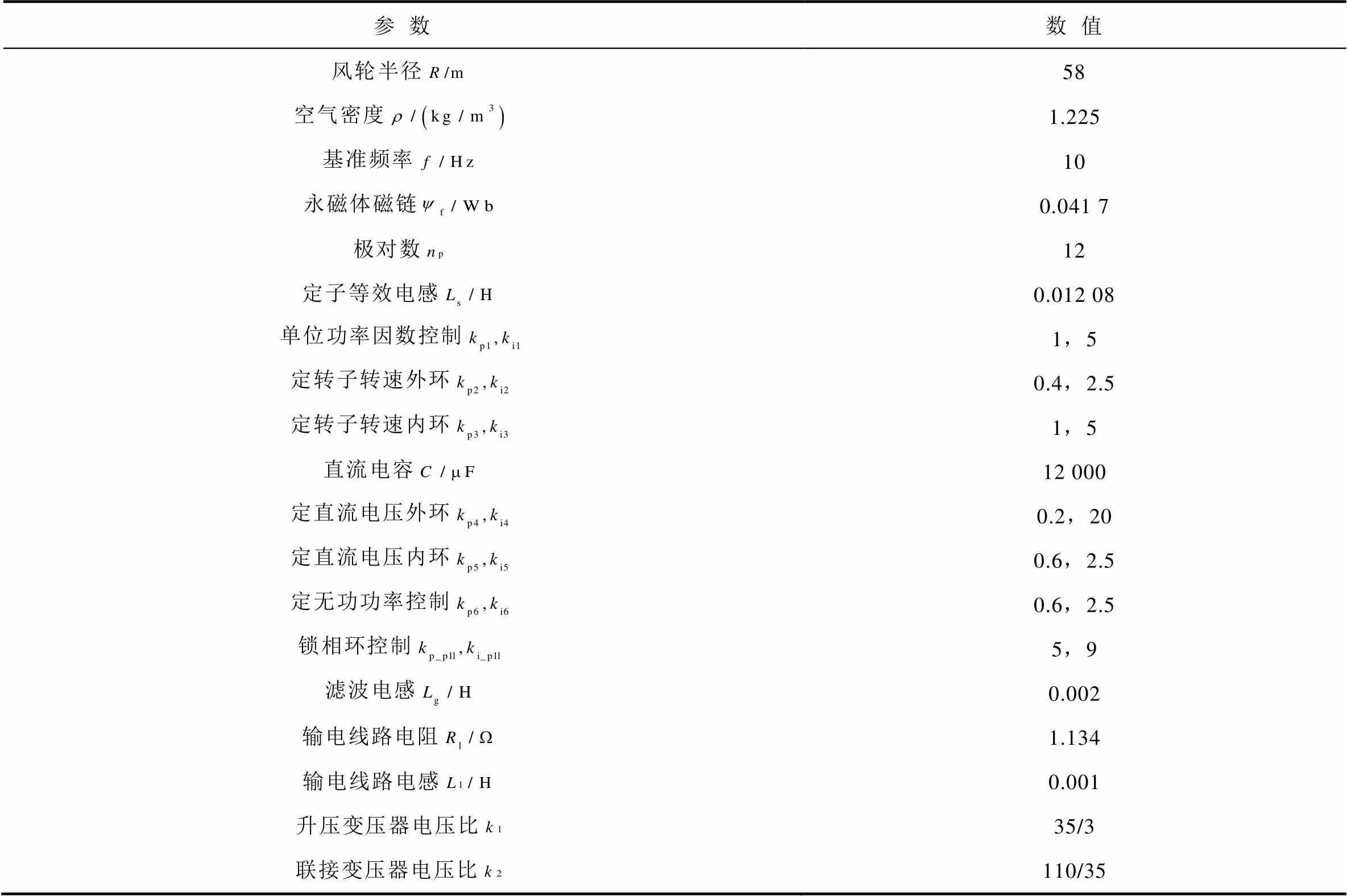 参数数值 风轮半径58 空气密度1.225 基准频率10 永磁体磁链0.041 7 极对数12 定子等效电感0.012 08 单位功率因数控制1,5 定转子转速外环0.4,2.5 定转子转速内环1,5 直流电容12 000 定直流电压外环0.2,20 定直流电压内环0.6,2.5 定无功功率控制0.6,2.5 锁相环控制5,9 滤波电感0.002 输电线路电阻1.134 输电线路电感0.001 升压变压器电压比35/3 联接变压器电压比110/35