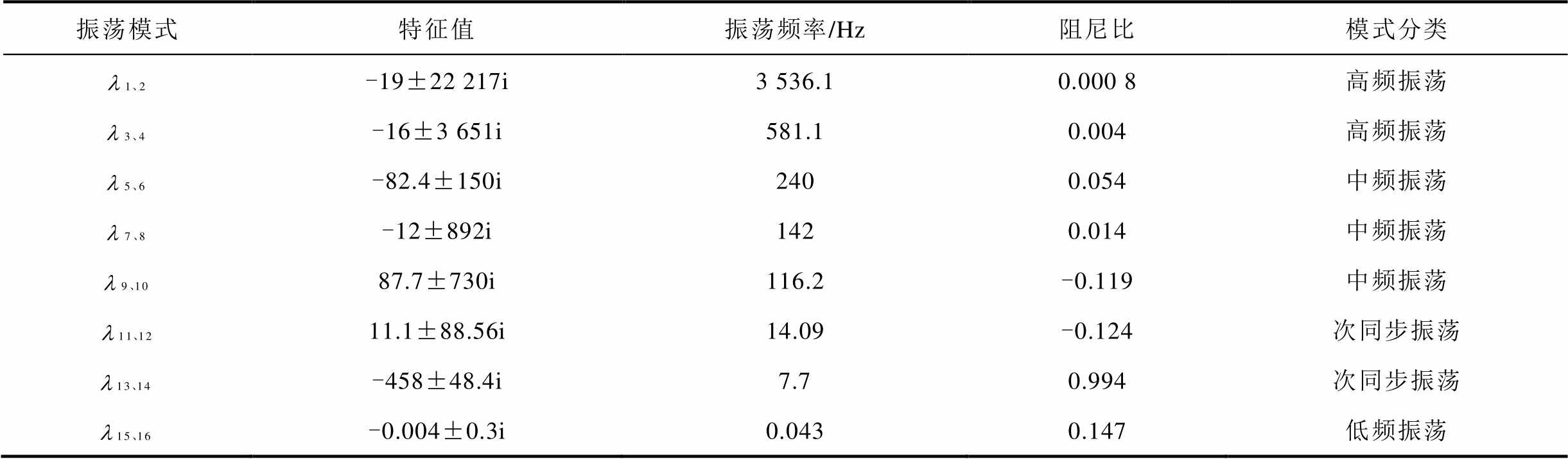 由表2可知,互联系统共有8个振荡模态,包括2个高频、3个中频、2个次同步和1个低频振荡模式,其中SSO模式(
