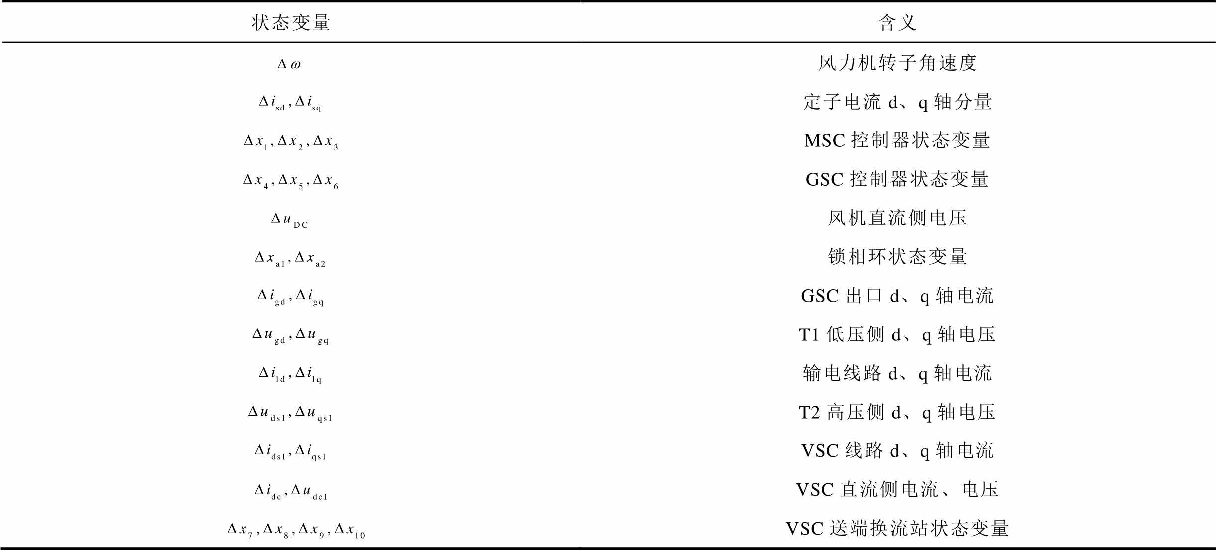状态变量含义 风力机转子角速度 定子电流d、q轴分量 MSC控制器状态变量 GSC控制器状态变量 风机直流侧电压 锁相环状态变量 GSC出口d、q轴电流 T1低压侧d、q轴电压 输电线路d、q轴电流 T2高压侧d、q轴电压 VSC线路d、q轴电流 VSC直流侧电流、电压 VSC送端换流站状态变量