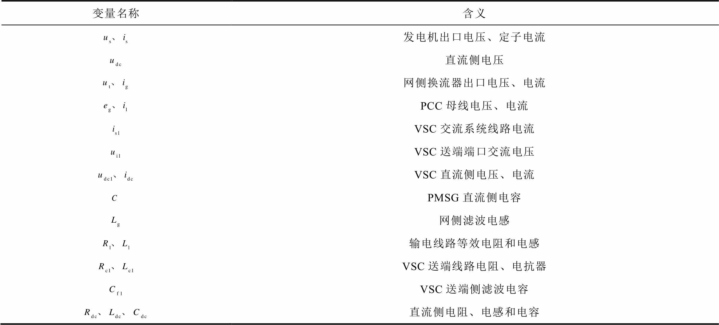 变量名称含义 发电机出口电压、定子电流 直流侧电压 网侧换流器出口电压、电流 PCC母线电压、电流 VSC交流系统线路电流 VSC送端端口交流电压 VSC直流侧电压、电流 PMSG直流侧电容 网侧滤波电感 输电线路等效电阻和电感 VSC送端线路电阻、电抗器 VSC送端侧滤波电容 直流侧电阻、电感和电容