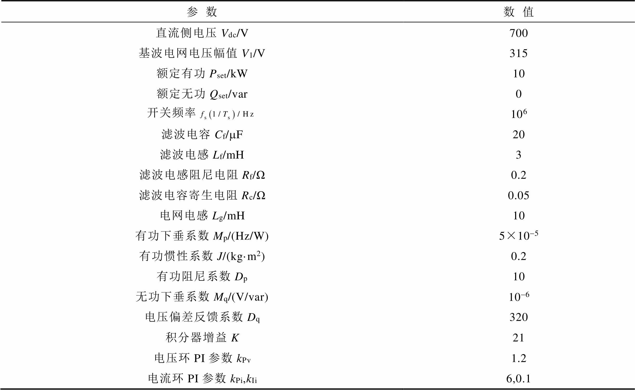 参数数值 直流侧电压Vdc/V700 基波电网电压幅值V1/V315 额定有功Pset/kW10 额定无功Qset/var0 开关频率106 滤波电容Cf/mF20 滤波电感Lf/mH3 滤波电感阻尼电阻Rf/Ω0.2 滤波电容寄生电阻Rc/Ω0.05 电网电感Lg/mH10 有功下垂系数Mp/(Hz/W)5×10-5 有功惯性系数J/(kg·m2)0.2 有功阻尼系数Dp10 无功下垂系数Mq/(V/var)10-6 电压偏差反馈系数Dq320 积分器增益K21 电压环PI参数kPv1.2 电流环PI参数kPi,kIi6,0.1