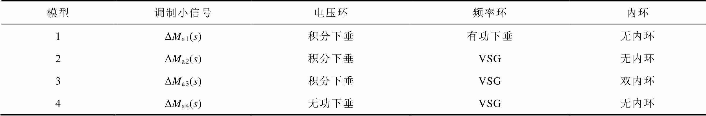 模型调制小信号电压环频率环内环 1ΔMa1(s)积分下垂有功下垂无内环 2ΔMa2(s)积分下垂VSG无内环 3ΔMa3(s)积分下垂VSG双内环 4ΔMa4(s)无功下垂VSG无内环