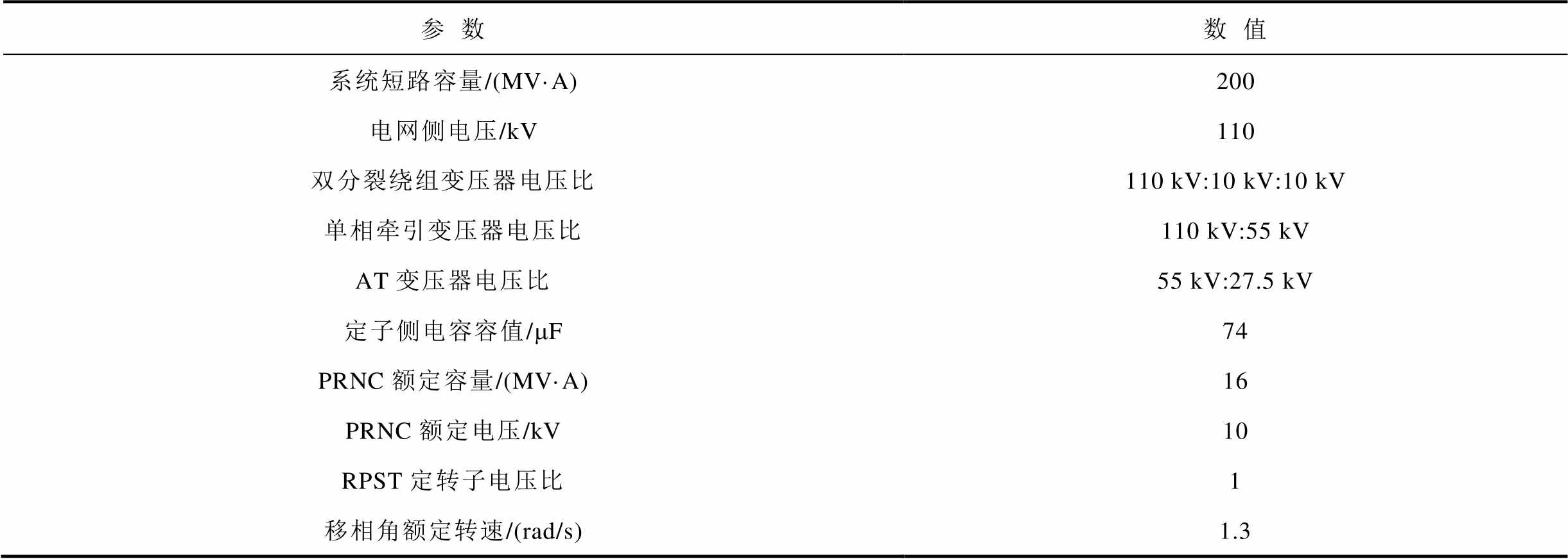 参数数值 系统短路容量/(MV·A)200 电网侧电压/kV110 双分裂绕组变压器电压比110 kV:10 kV:10 kV 单相牵引变压器电压比110 kV:55 kV AT变压器电压比55 kV:27.5 kV 定子侧电容容值/mF74 PRNC额定容量/(MV·A)16 PRNC额定电压/kV10 RPST定转子电压比1 移相角额定转速/(rad/s)1.3