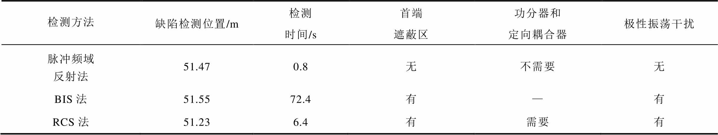 检测方法缺陷检测位置/m检测时间/s首端遮蔽区功分器和定向耦合器极性振荡干扰 脉冲频域反射法51.470.8无不需要无 BIS法51.5572.4有—有 RCS法51.236.4有需要有