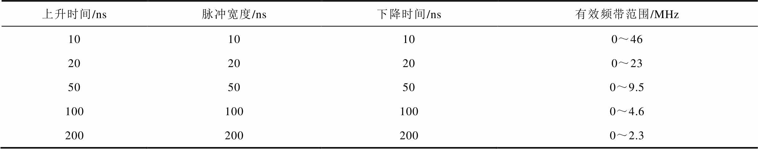 上升时间/ns脉冲宽度/ns下降时间/ns有效频带范围/MHz 1010100~46 2020200~23 5050500~9.5 1001001000~4.6 2002002000~2.3