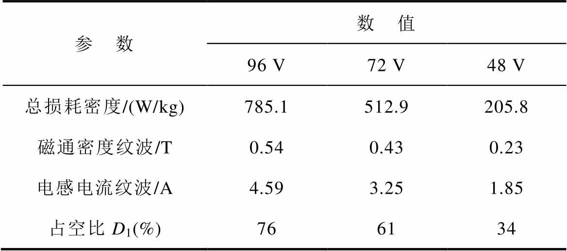 参 数数 值 96 V72 V48 V 总损耗密度/(W/kg)785.1512.9205.8 磁通密度纹波/T0.540.430.23 电感电流纹波/A4.593.251.85 占空比D1(%)766134