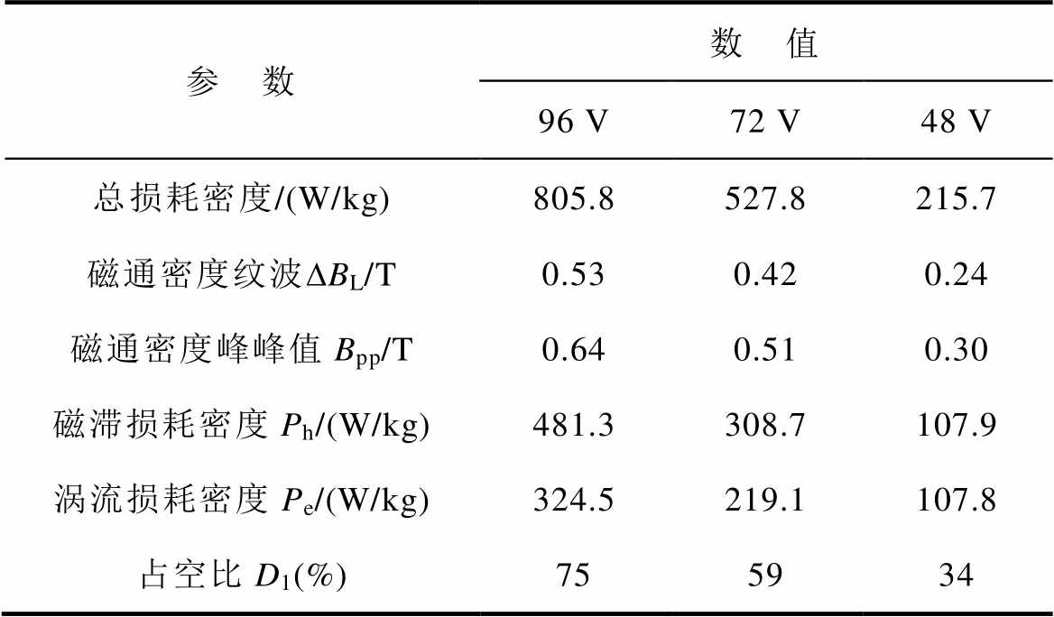 参 数数 值 96 V72 V48 V 总损耗密度/(W/kg)805.8527.8215.7 磁通密度纹波DBL/T0.530.420.24 磁通密度峰峰值Bpp/T0.640.510.30 磁滞损耗密度Ph/(W/kg)481.3308.7107.9 涡流损耗密度Pe/(W/kg)324.5219.1107.8 占空比D1(%)755934