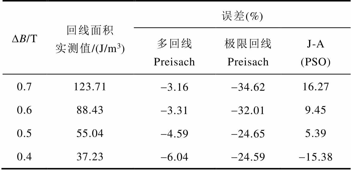 DB/T回线面积实测值/(J/m3)误差(%) 多回线 Preisach极限回线 PreisachJ-A (PSO) 0.7123.71-3.16-34.6216.27 0.688.43-3.31-32.019.45 0.555.04-4.59-24.655.39 0.437.23-6.04-24.59-15.38