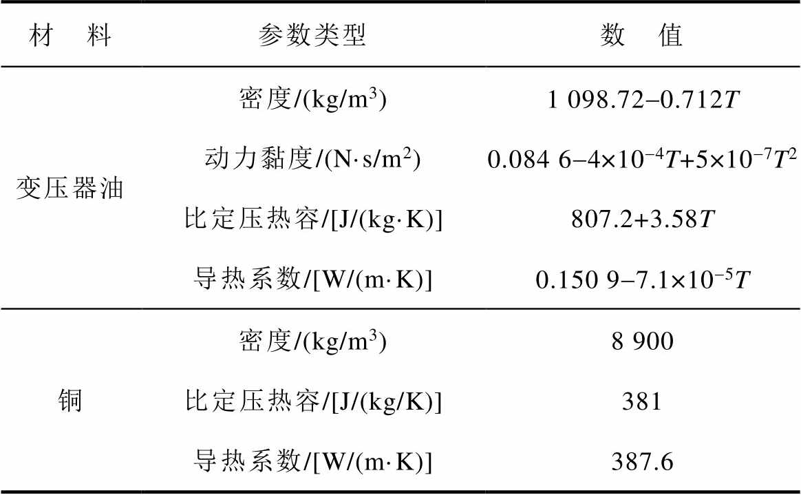 材 料参数类型数 值 变压器油密度/(kg/m3)1 098.72-0.712T 动力黏度/(N·s/m2)0.084 6-4×10-4T+5×10-7T2 比定压热容/[J/(kg·K)]807.2+3.58T 导热系数/[W/(m·K)]0.150 9-7.1×10-5T 铜密度/(kg/m3)8 900 比定压热容/[J/(kg/K)]381 导热系数/[W/(m·K)]387.6
