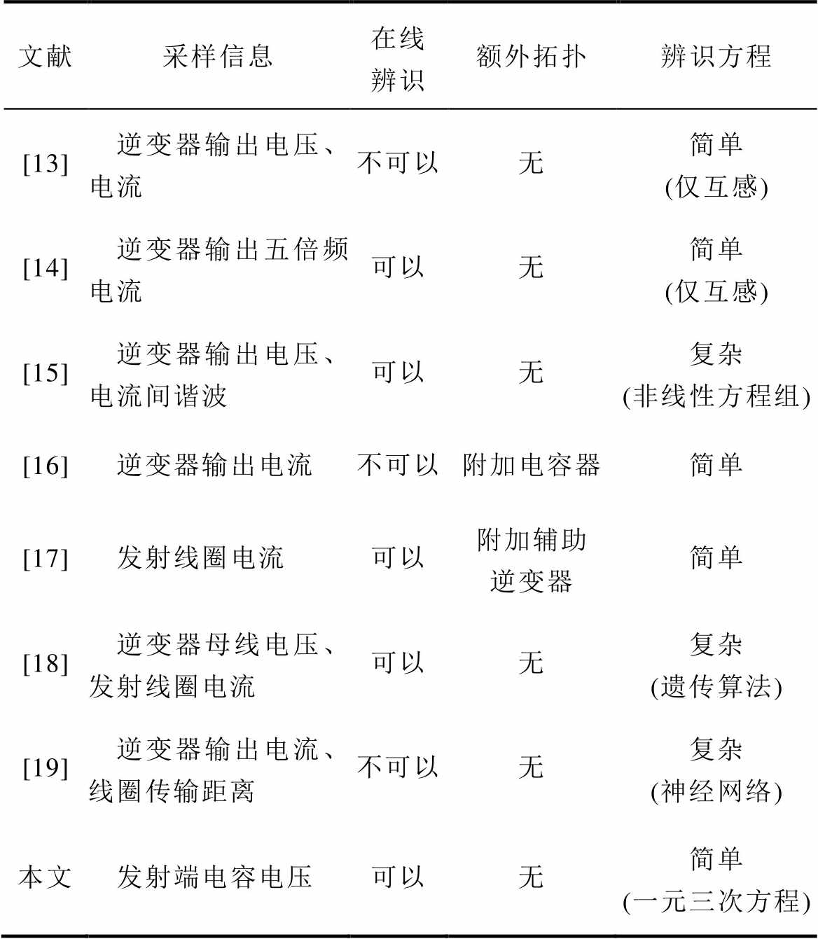 文献采样信息在线辨识额外拓扑辨识方程 [13]逆变器输出电压、电流不可以无简单 (仅互感) [14]逆变器输出五倍频电流可以无简单 (仅互感) [15]逆变器输出电压、电流间谐波可以无复杂 (非线性方程组) [16]逆变器输出电流不可以附加电容器简单 [17]发射线圈电流可以附加辅助逆变器简单 [18]逆变器母线电压、发射线圈电流可以无复杂 (遗传算法) [19]逆变器输出电流、线圈传输距离不可以无复杂 (神经网络) 本文发射端电容电压可以无简单 (一元三次方程)