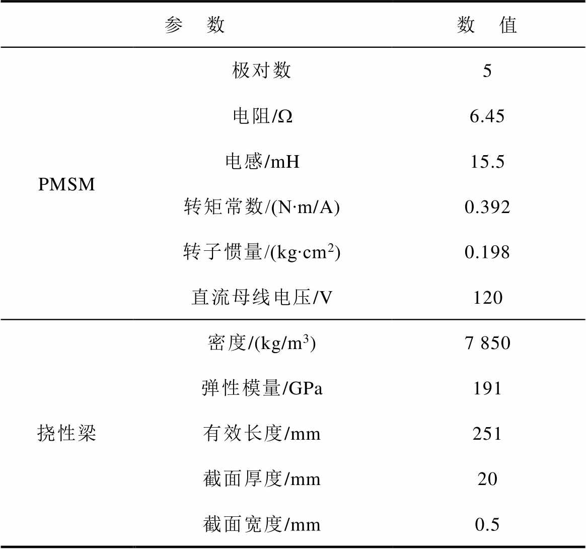 参 数数 值 PMSM极对数5 电阻/W6.45 电感/mH15.5 转矩常数/(N∙m/A)0.392 转子惯量/(kg∙cm2)0.198 直流母线电压/V120 挠性梁密度/(kg/m3)7 850 弹性模量/GPa191 有效长度/mm251 截面厚度/mm20 截面宽度/mm0.5