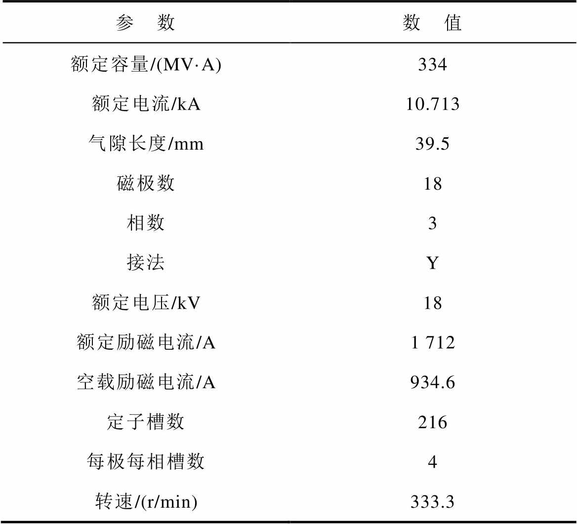 参 数数 值 额定容量/(MV·A)334 额定电流/kA10.713 气隙长度/mm39.5 磁极数18 相数3 接法Y 额定电压/kV18 额定励磁电流/A1 712 空载励磁电流/A934.6 定子槽数216 每极每相槽数4 转速/(r/min)333.3