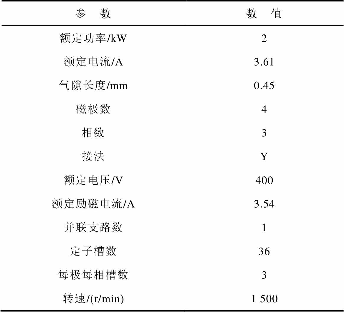 参 数数 值 额定功率/kW2 额定电流/A3.61 气隙长度/mm0.45 磁极数4 相数3 接法Y 额定电压/V400 额定励磁电流/A3.54 并联支路数1 定子槽数36 每极每相槽数3 转速/(r/min)1 500