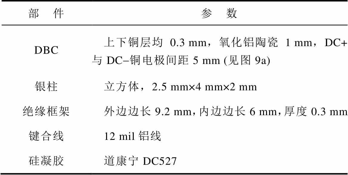部 件参 数 DBC上下铜层均0.3 mm,氧化铝陶瓷1 mm,DC+与DC-铜电极间距5 mm (见图9a) 银柱立方体,2.5 mm×4 mm×2 mm 绝缘框架外边边长9.2 mm,内边边长6 mm,厚度0.3 mm 键合线12 mil铝线 硅凝胶道康宁DC527