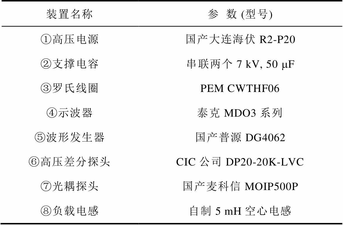 装置名称参数 (型号) ①高压电源国产大连海伏R2-P20 ②支撑电容串联两个7 kV, 50 mF ③罗氏线圈PEM CWTHF06 ④示波器泰克MDO3系列 ⑤波形发生器国产普源DG4062 ⑥高压差分探头CIC公司DP20-20K-LVC ⑦光耦探头国产麦科信MOIP500P ⑧负载电感自制5 mH空心电感