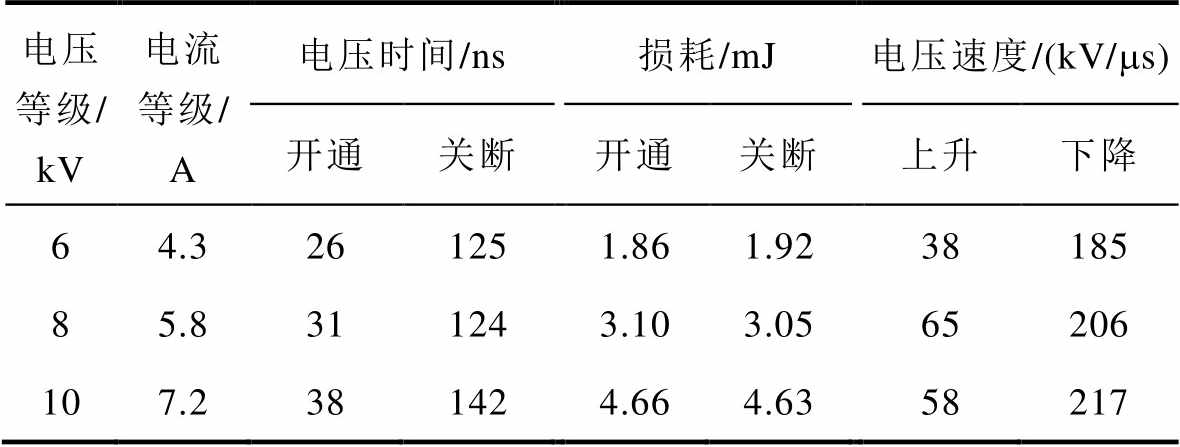 电压等级/ kV电流等级/ A电压时间/ns损耗/mJ电压速度/(kV/ms) 开通关断开通关断上升下降 64.3261251.861.9238185 85.8311243.103.0565206 107.2381424.664.6358217