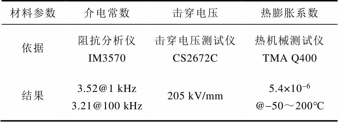 材料参数介电常数击穿电压热膨胀系数 依据阻抗分析仪IM3570击穿电压测试仪CS2672C热机械测试仪TMA Q400 结果3.52@1 kHz 3.21@100 kHz205 kV/mm5.4×10-6 @-50~200℃
