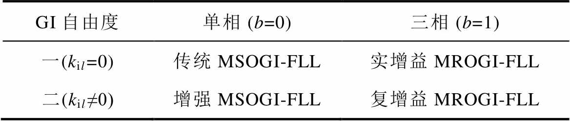 GI自由度单相 (b=0)三相 (b=1) 一(kil=0)传统MSOGI-FLL实增益MROGI-FLL 二(kil≠0)增强MSOGI-FLL复增益MROGI-FLL