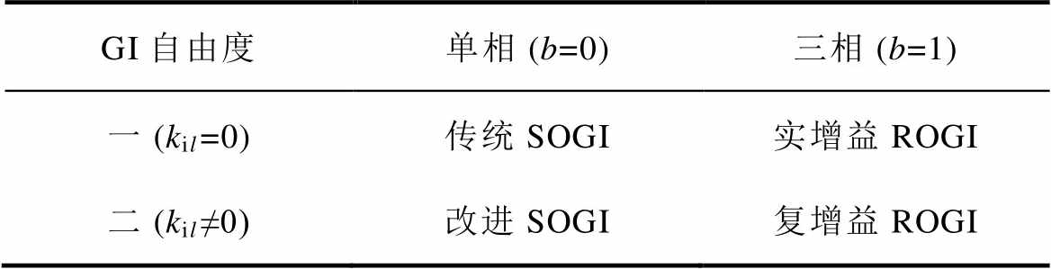 GI自由度单相 (b=0)三相 (b=1) 一 (kil=0)传统SOGI实增益ROGI 二 (kil≠0)改进SOGI复增益ROGI