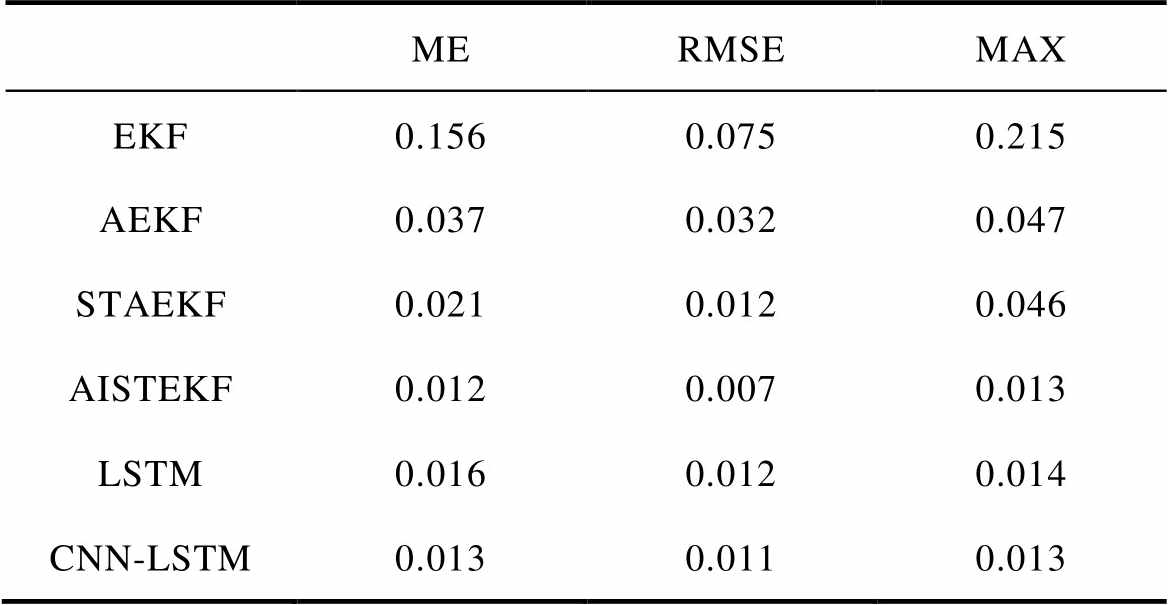 MERMSEMAX EKF0.1560.0750.215 AEKF0.0370.0320.047 STAEKF0.0210.0120.046 AISTEKF0.0120.0070.013 LSTM0.0160.0120.014 CNN-LSTM0.0130.0110.013