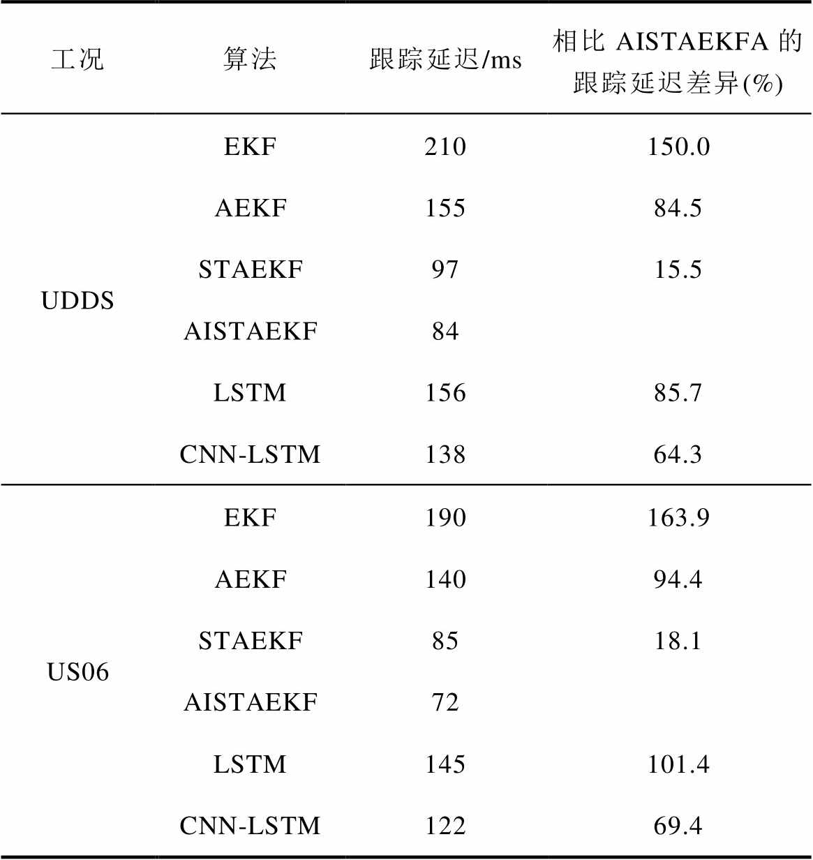 工况算法跟踪延迟/ms相比AISTAEKFA的跟踪延迟差异(%) UDDSEKF210150.0 AEKF15584.5 STAEKF9715.5 AISTAEKF84 LSTM15685.7 CNN-LSTM13864.3 US06EKF190163.9 AEKF14094.4 STAEKF8518.1 AISTAEKF72 LSTM145101.4 CNN-LSTM12269.4