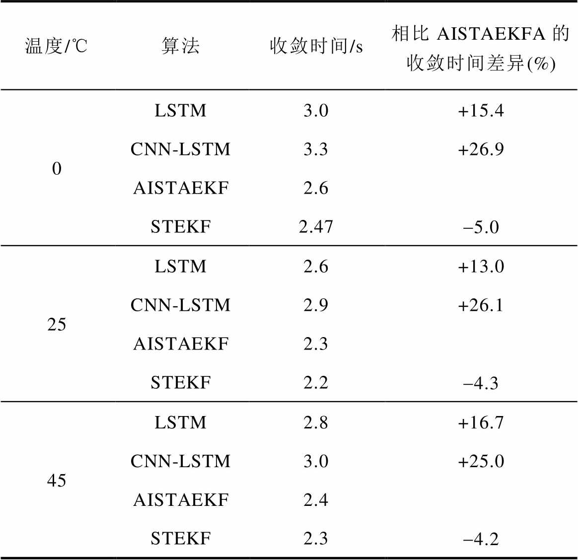 温度/℃算法收敛时间/s相比AISTAEKFA的收敛时间差异(%) 0LSTM3.0+15.4 CNN-LSTM3.3+26.9 AISTAEKF2.6 STEKF2.47-5.0 25LSTM2.6+13.0 CNN-LSTM2.9+26.1 AISTAEKF2.3 STEKF2.2-4.3 45LSTM2.8+16.7 CNN-LSTM3.0+25.0 AISTAEKF2.4 STEKF2.3-4.2