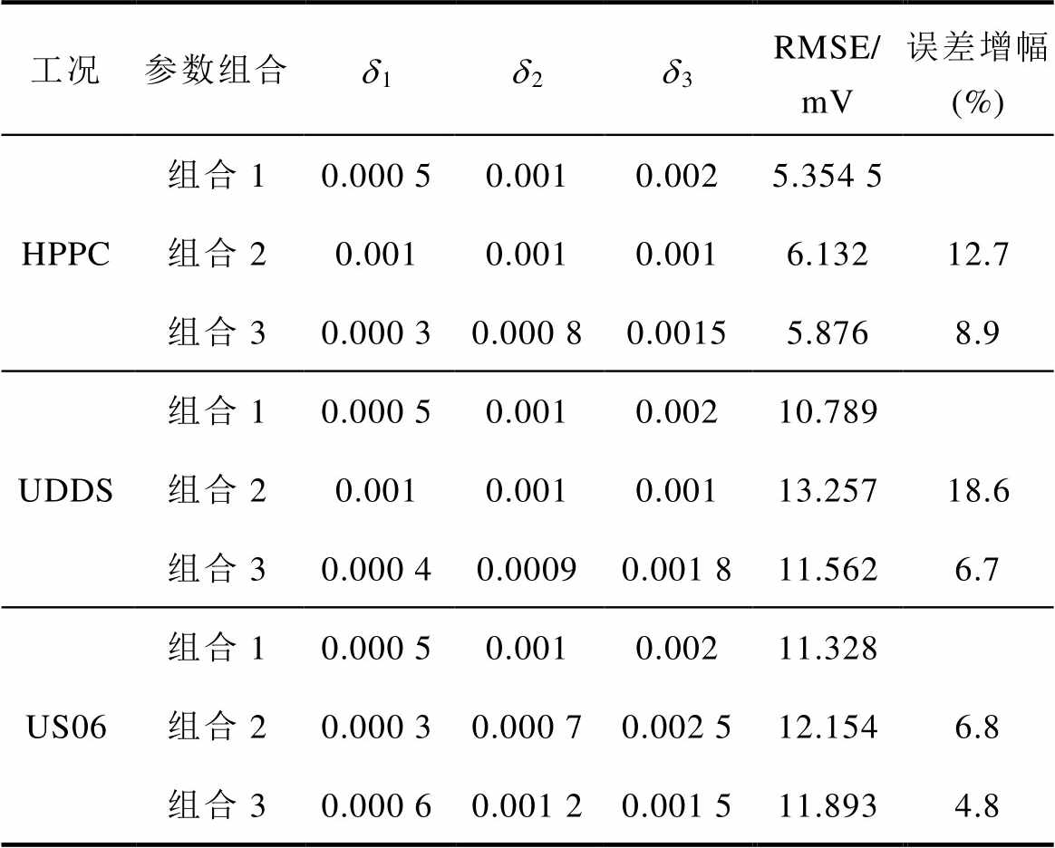 工况参数组合d1d2d3RMSE/ mV误差增幅 (%) HPPC组合10.000 50.0010.0025.354 5 组合20.0010.0010.0016.13212.7 组合30.000 30.000 80.00155.8768.9 UDDS组合10.000 50.0010.00210.789 组合20.0010.0010.00113.25718.6 组合30.000 40.00090.001 811.5626.7 US06组合10.000 50.0010.00211.328 组合20.000 30.000 70.002 512.1546.8 组合30.000 60.001 20.001 511.8934.8