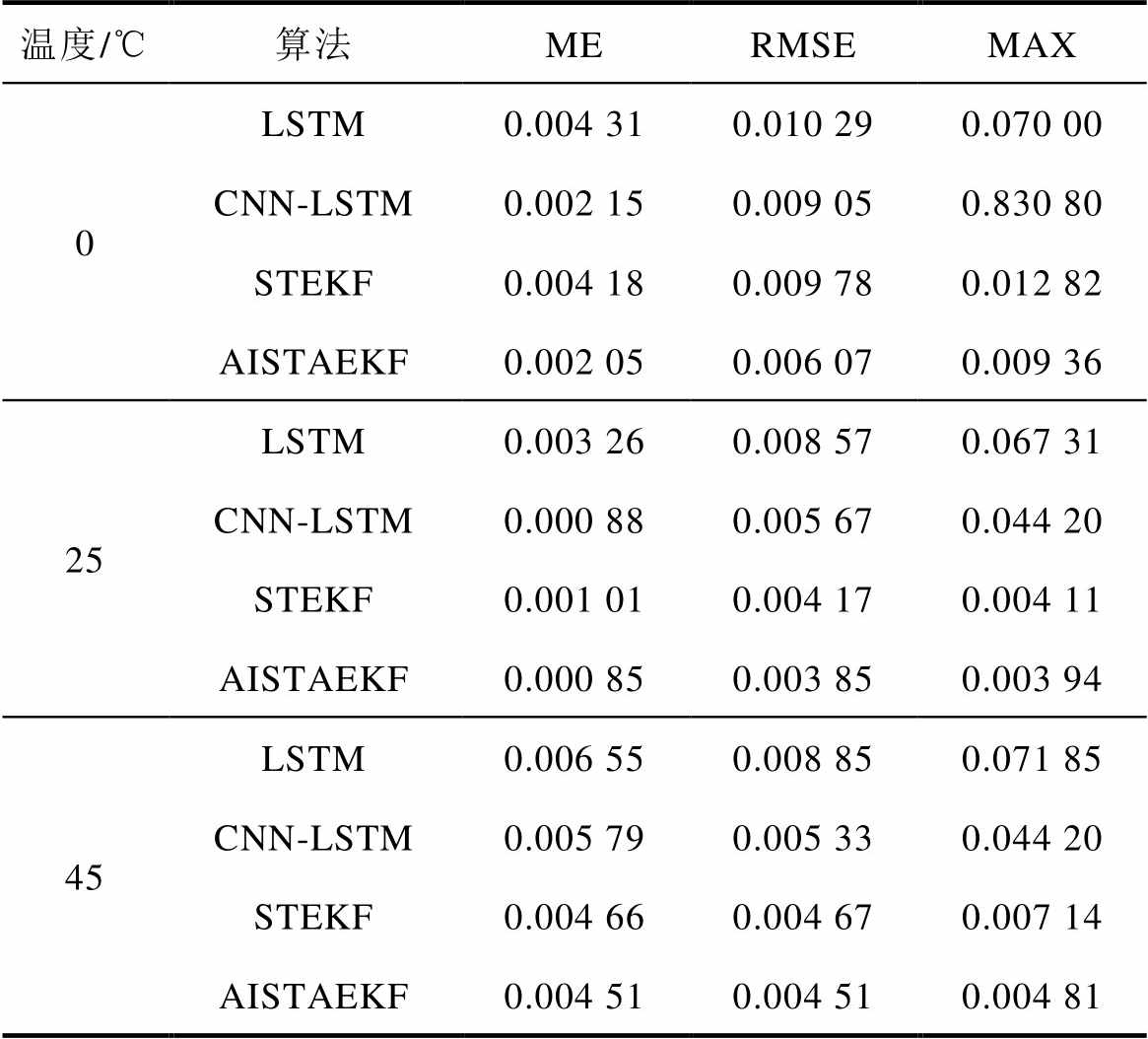 测试结果表明,AISTAEKF算法在宽温域范围(0℃~45℃)内均能将SOC估计误差稳定控制在较小范围内。