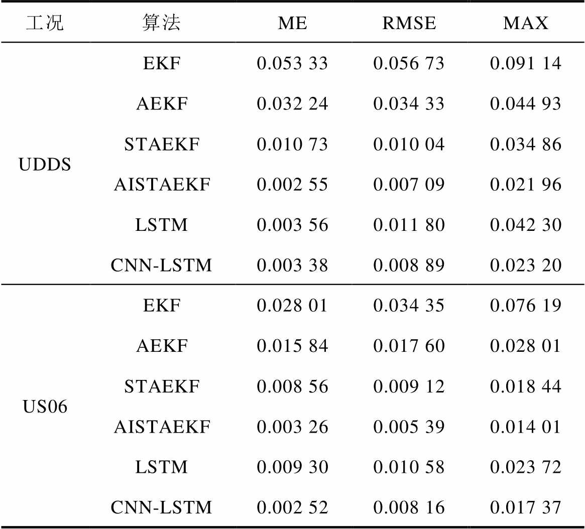 (3)LSTM和CNN-LSTM依赖历史数据学习,UDDS工况下RMSE分别为0.011 80和0.008 89,US06工况下因电流大范围突变导致最大误差MAX分别达0.023 72和0.017 37,原因为:当数据集不充足时,缺乏物理建模难以捕捉极化滞后。若训练样本充足,可在一定程度提升自主学习电流突变与极化滞后的时间关联、温度对滞后程度的影响规律、以及老化状态下滞后特性漂移趋势等能力,实现SOC估计偏差减少,但训练与迭代过程复杂。